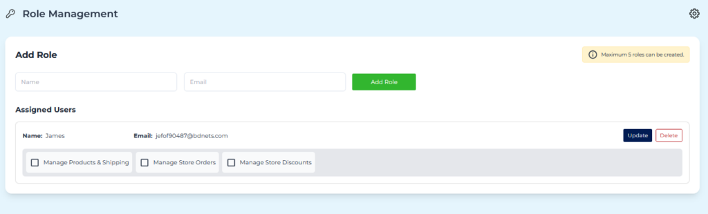 From the Role Management section, you can add up to five users to help manage your store. Each user can be assigned specific roles to ensure your store’s privacy and security. Currently, you can choose from three roles: Manage Products & Shipping, Manage Store Orders, and Manage Store Discounts. Simply select the role you want to assign, and the user will only have access to that area. You can update their access anytime by checking or unchecking the roles and clicking Update, or remove them completely by deleting the assignee.