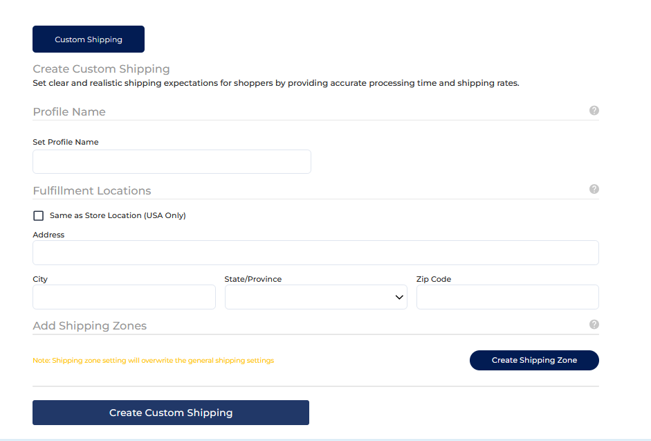 When you click on “Create Custom Shipping Profile,” a form will appear where you can enter all the required details. Start by setting a name for your shipping profile and adding the location from where you will ship your orders.