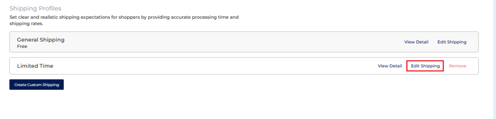 When you click “Edit,” you’ll be redirected to the profile page, where you can easily review and modify your shipping settings. Make any necessary adjustments, such as updating rates, delivery days, or zones, and then click “Save Profile” to apply and update your custom shipping profile successfully.