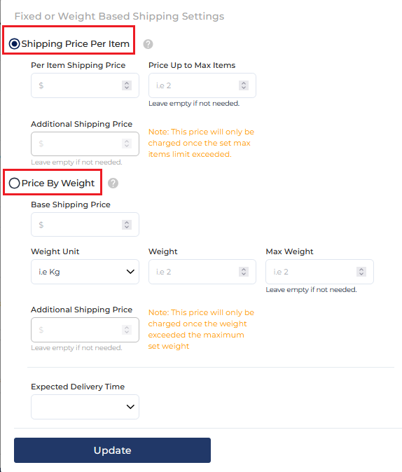 A pop-up window will then appear, allowing you to decide whether to set shipping prices based on the number of items or the weight of the products. After choosing your pricing method, fill in the required details such as shipping rates, any additional rate, and expected delivery days. Finally, click “Update” to save your shipping profile. Your custom shipping profile will now be ready for use.