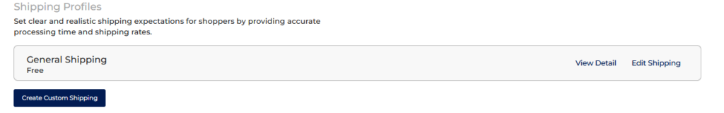 By clicking on “Shipping Profiles,” you will be directed to a page where you can select from pre-made shipping profiles, such as the General Shipping option. Alternatively, you have the flexibility to create your own Custom Shipping profile tailored to your specific needs. This allows you to offer the best shipping options for your business and customers.