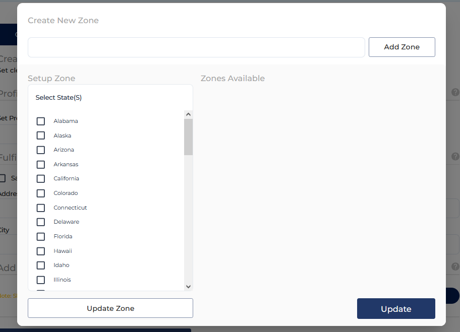Next, create your shipping zones by naming them and selecting one or multiple regions to include in each zone. When the zones are created, click on Update.